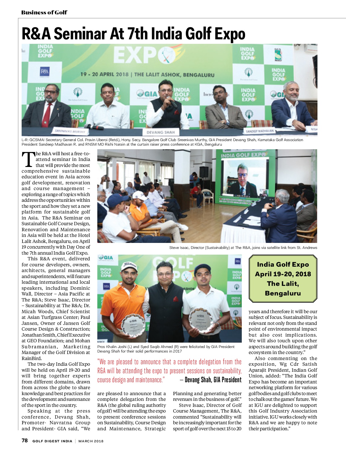 India Golf Expo (IGE), South Asia’s largest golf industry trade show, returns with its seventh edition from April 19-20, 2018 in Bangalore.